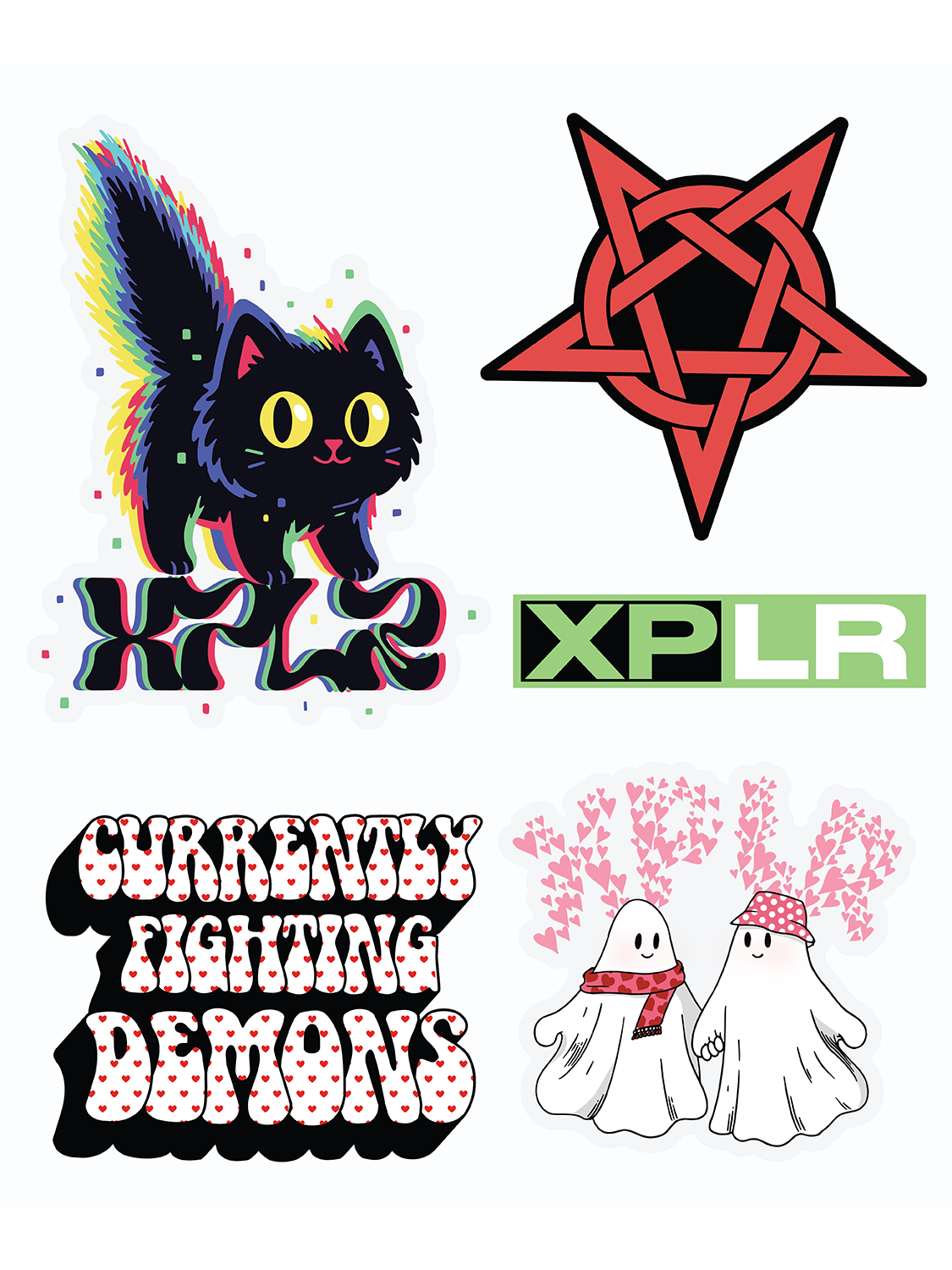 The February 2026 Sticker Sheet brings together the most loved themes of the season, spooky, cute, emo, and iconic, all in one collectible set. Each sticker tells its own little story: the neon Bad Luck Cat for fans of chaotic charm, the clean XPLR bar for a classic touch, the “Currently Fighting Demons” bubble text for anyone who relates a little too much, the pentagram for the paranormal lovers, and the adorable ghost couple for the soft, romantic side of the fandom. This sheet is perfect for decorating laptops, water bottles, notebooks, or anything that needs a mix of sweetness and supernatural energy.