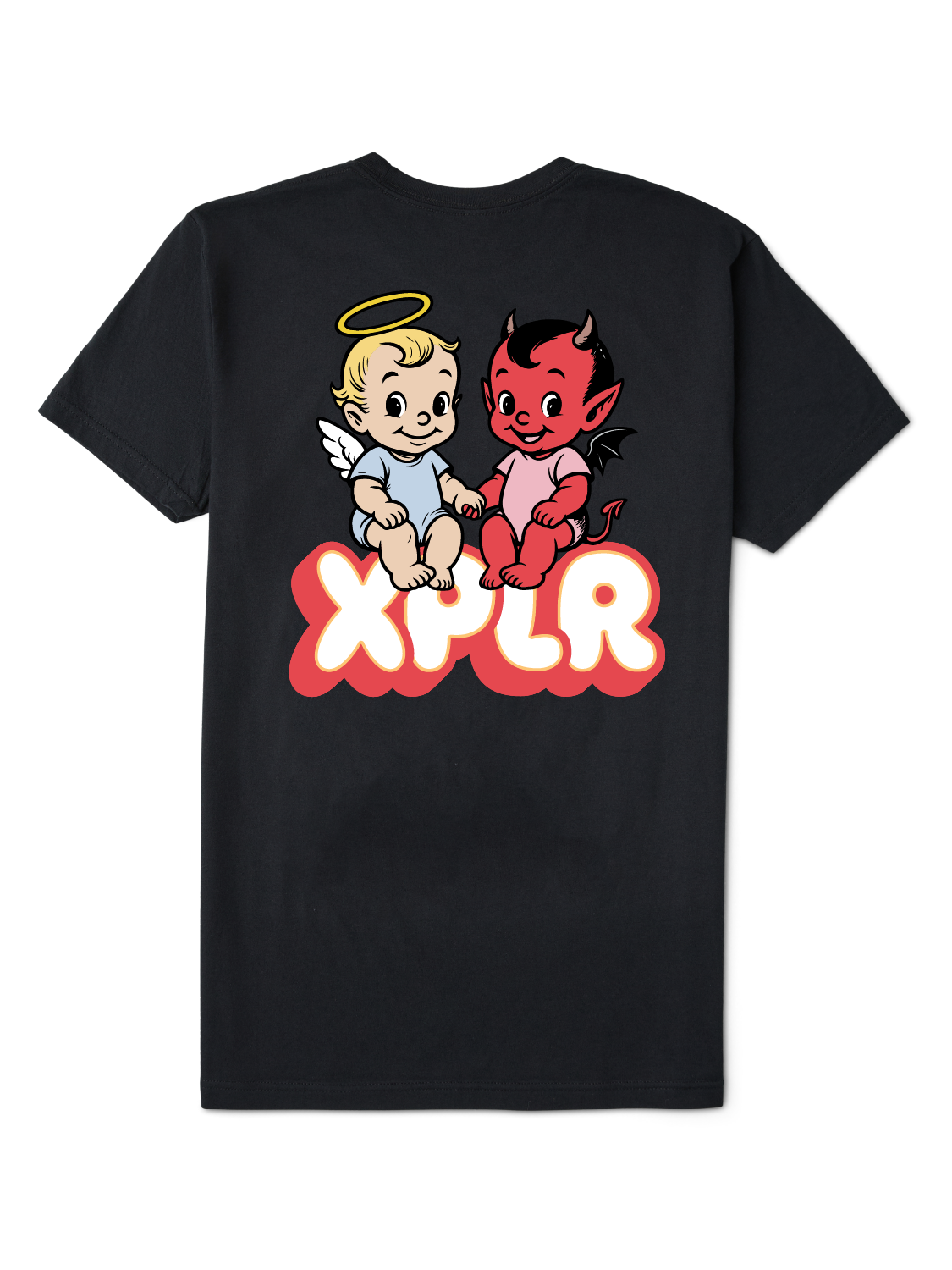 The Heaven Sent Tee brings the same duality to a clean, everyday fit. With the baby angel and devil perched above the soft XPLR logo, it’s a reminder that adventure lives between curiosity and chaos. Perfect for those who embrace both sides of the unknown.