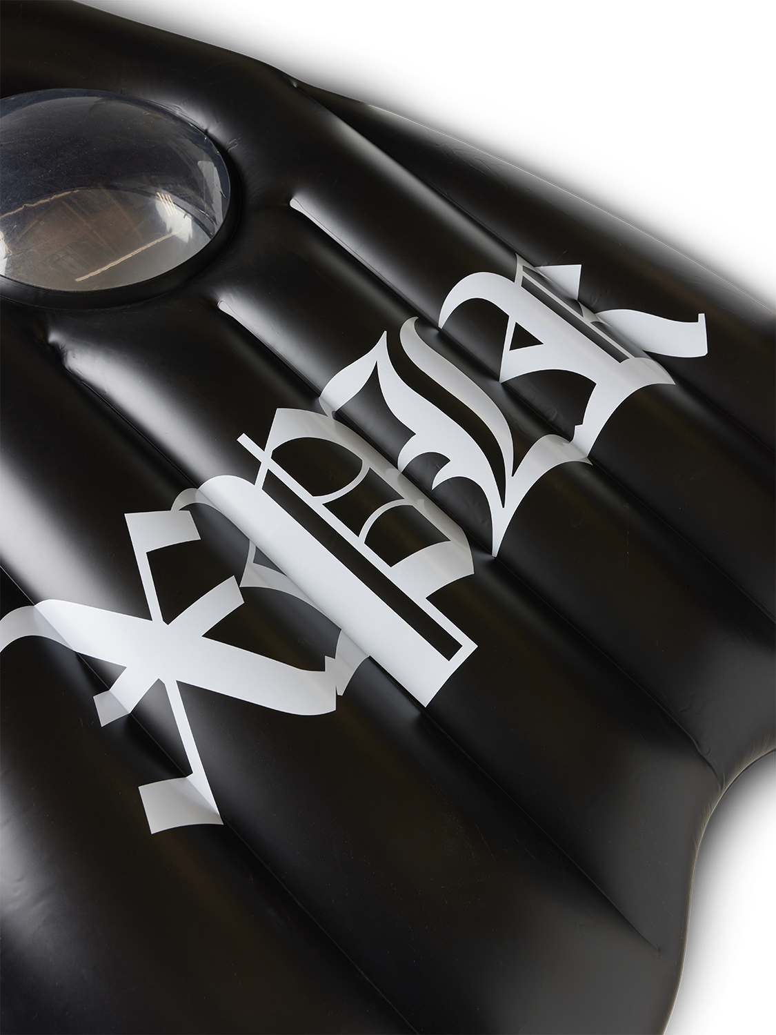Inflatable planchette-shaped pool float with clear bubble viewing window