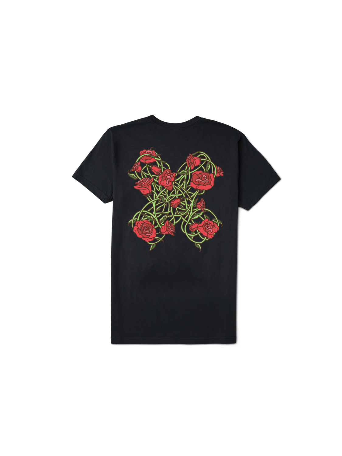 The Rosy Tee brings the collection’s floral motif into a lighter everyday form, pairing a refined script at the front with a dramatic arrangement of winding green stems and vivid red roses across the back that feels romantic, graphic, and slightly untamed. Set on a black base that sharpens every line and color, it was made for the person who wants their casual staples to still feel expressive, whether worn alone on warmer days, layered under outerwear, or styled as a subtle statement with a darker edge. There is an effortless tension in the way softness and intensity meet here, turning a simple tee into something memorable, modern, and full of quiet attitude.