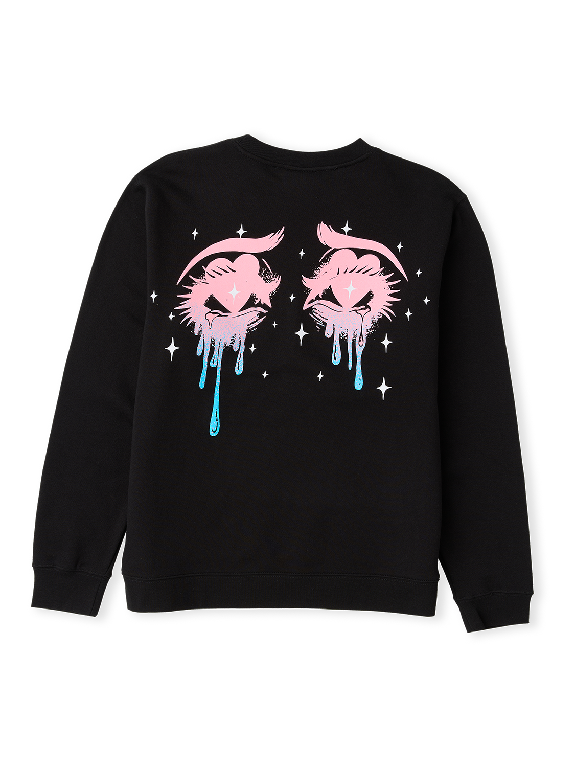 The Tears Crewneck was created to blend softness with surreal emotion, turning a simple sweatshirt into a dreamy statement piece. The front features a clean, pink XPLR script that keeps things subtle and classic, while the back reveals two vibrant, star-lit eyes dripping in bold colors for a burst of expressive energy. Perfect for anyone who loves ethereal aesthetics, playful color contrasts, and clothing that feels both artistic and deeply personal.