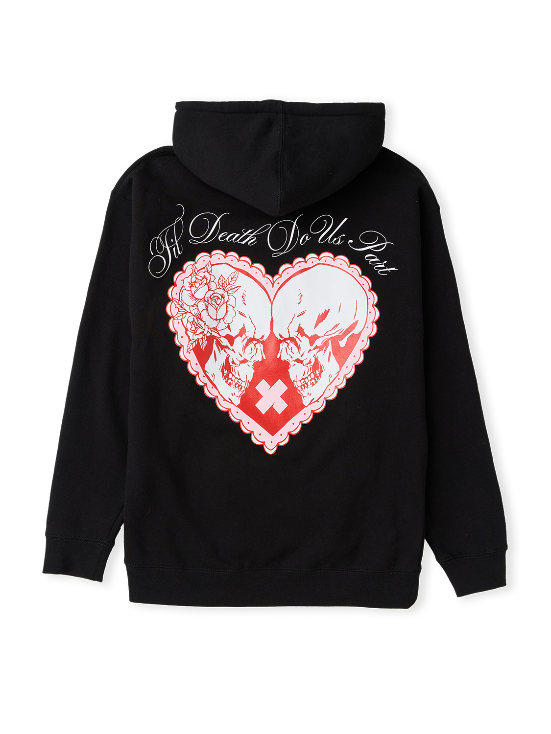 The ’Til Death Do Us Part Hoodie blends romance with a darker, poetic edge, perfect for anyone who loves love with a twist. The front keeps things sleek with elegant script lettering, while the back unveils a bold heart-shaped graphic featuring two skulls, roses, and the signature X, symbolizing devotion that lasts beyond this lifetime. Cozy, striking, and unapologetically dramatic, this hoodie is made for those who wear their passion proudly.